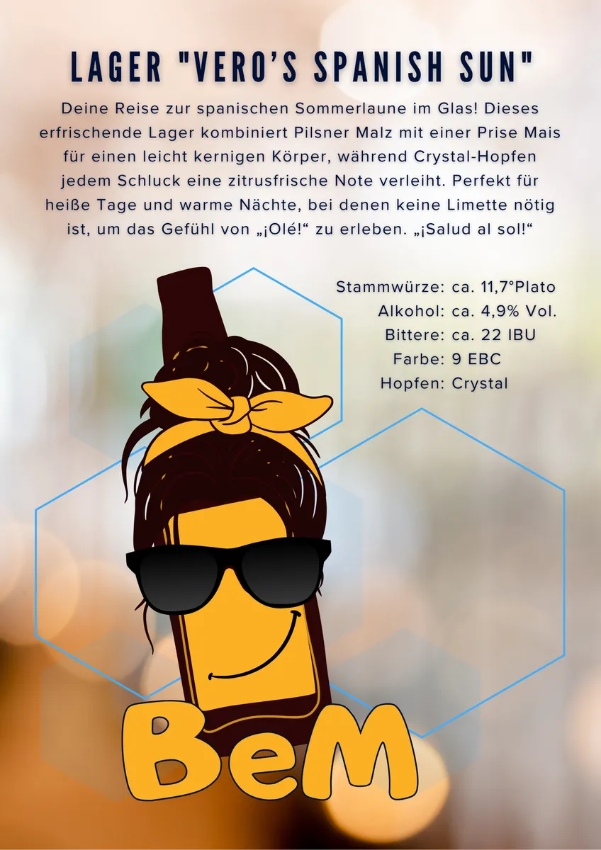 ¡Salud al sol! 'Vero’s Spanish Sun' ist dein sonniges Lager mit Pilsner Malz, einem Hauch Mais und zitrusfrischem Crystal-Hopfen. Leicht, erfrischend und mit mediterranem Flair – Sommerfeeling pur im Glas.