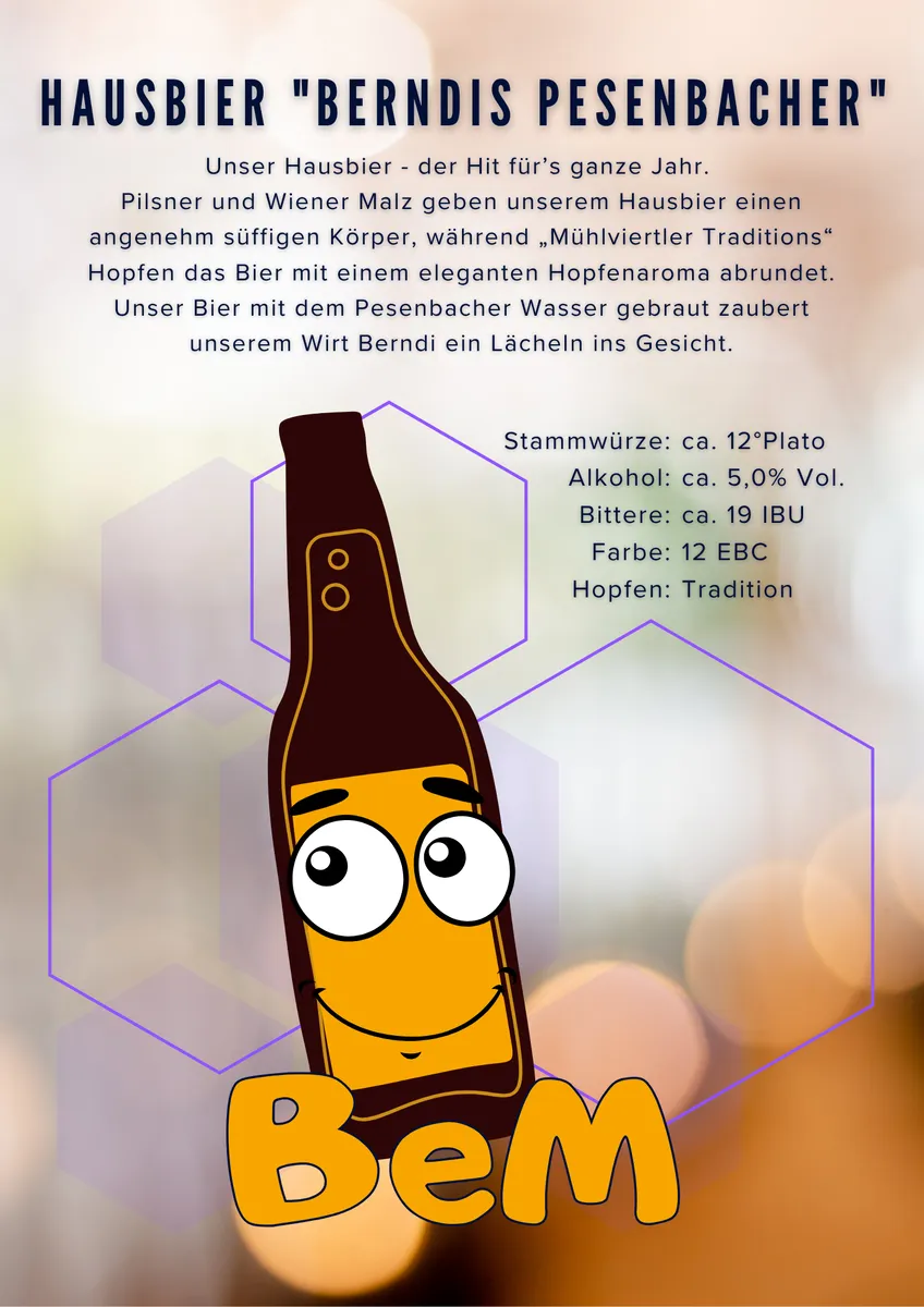 Unser Hausbier mit Charakter: 'Berndis Pesenbacher' vereint Wiener und Pilsner Malz zu einem harmonischen Körper, fein ausbalanciert durch Mühlviertler Tradition-Hopfen – süffig, ehrlich und unverkennbar BeerMotions.