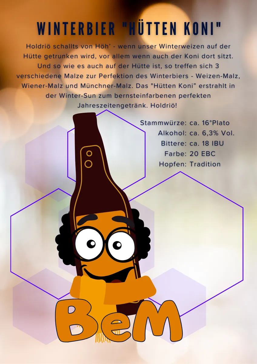 Holdriö vom Gipfel! 'Hütten Koni' vereint Weizen-, Wiener- und Münchner-Malz zu einem bernsteinfarbenen Winterweizen mit Charakter. Vollmundig, wärmend und mit feinem Tradition-Hopfen – das perfekte Bier für kalte Tage und gute Laune.